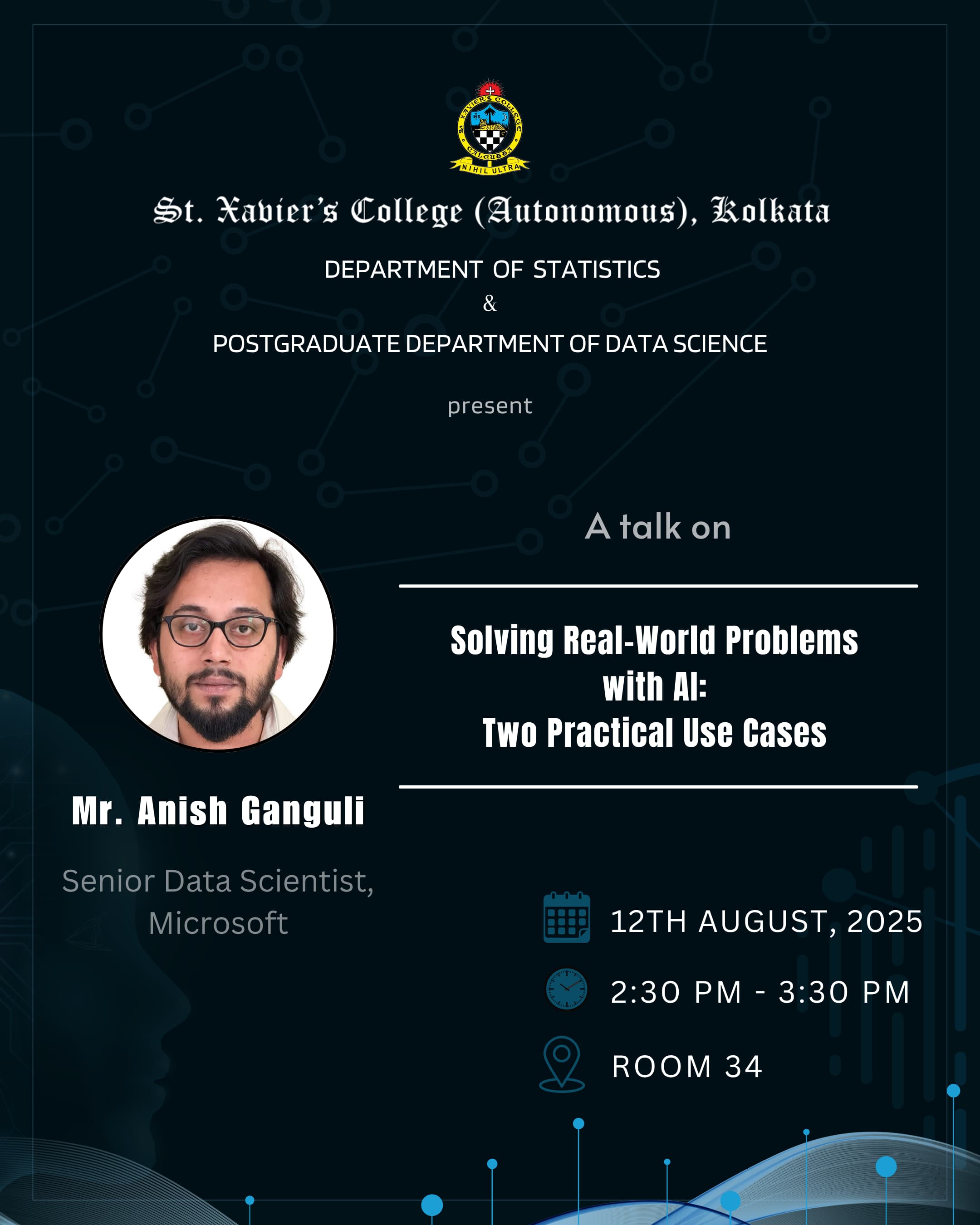 Mr. Anish Ganguli, Senior Data Scientist at Microsoft delivered a talk titled "Solving Real-World Problems with AI: Two Practical Use Cases" navigating the process of converting business questions into technical models suitable for analysis on 12th August, 2025 at the talk session organized by the Department of Statistics and the Postgraduate Department of Data Science.