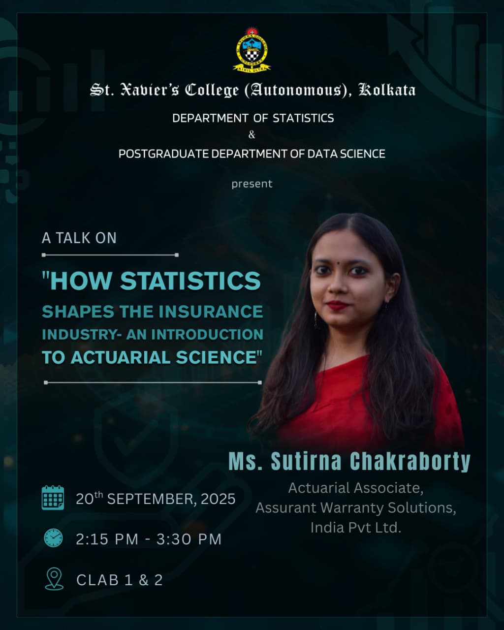 Ms. Sutirna Chakraborty, Actuarial Associate from Assurant Warranty Solutions, India Pvt. Ltd. delivered an invited talk on "How Statistics Shapes the Insurance Industry - An Introduction to Actuarial Science" on 20th September, 2025, which provideda clear understanding of the usage of statistics and data in insurance through the introduction of actuarial models and highlighted potential career paths in the field.